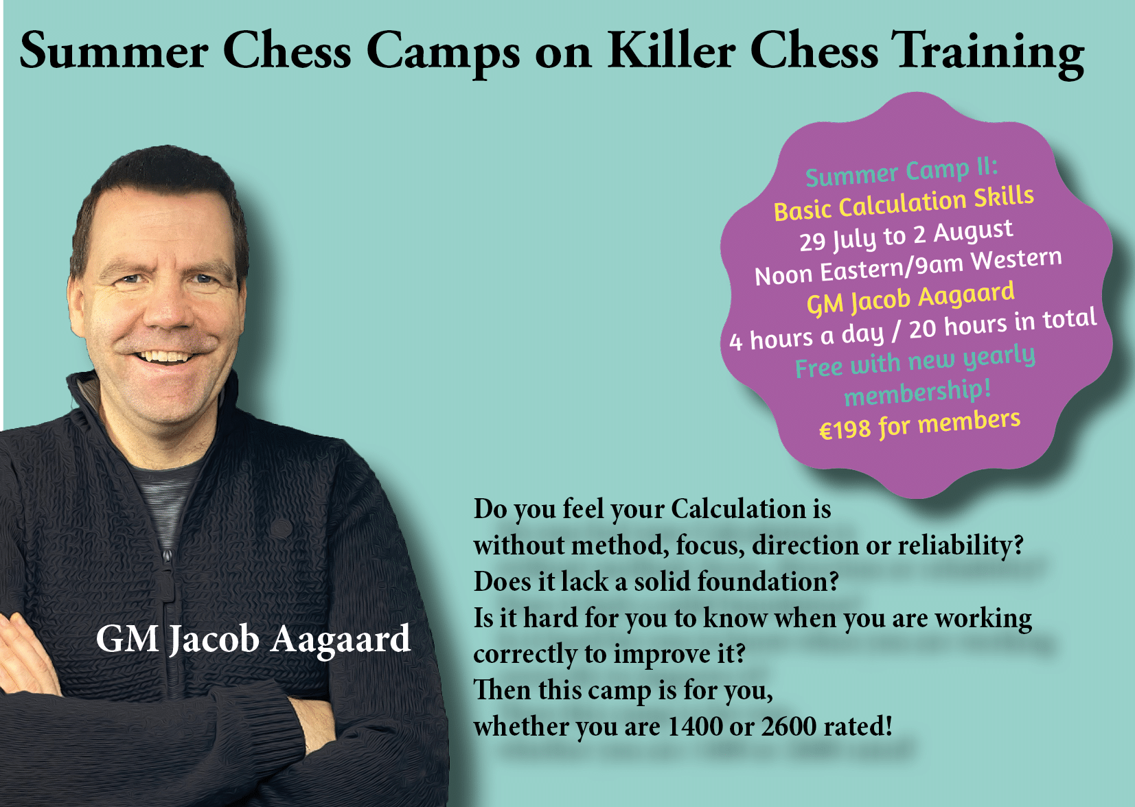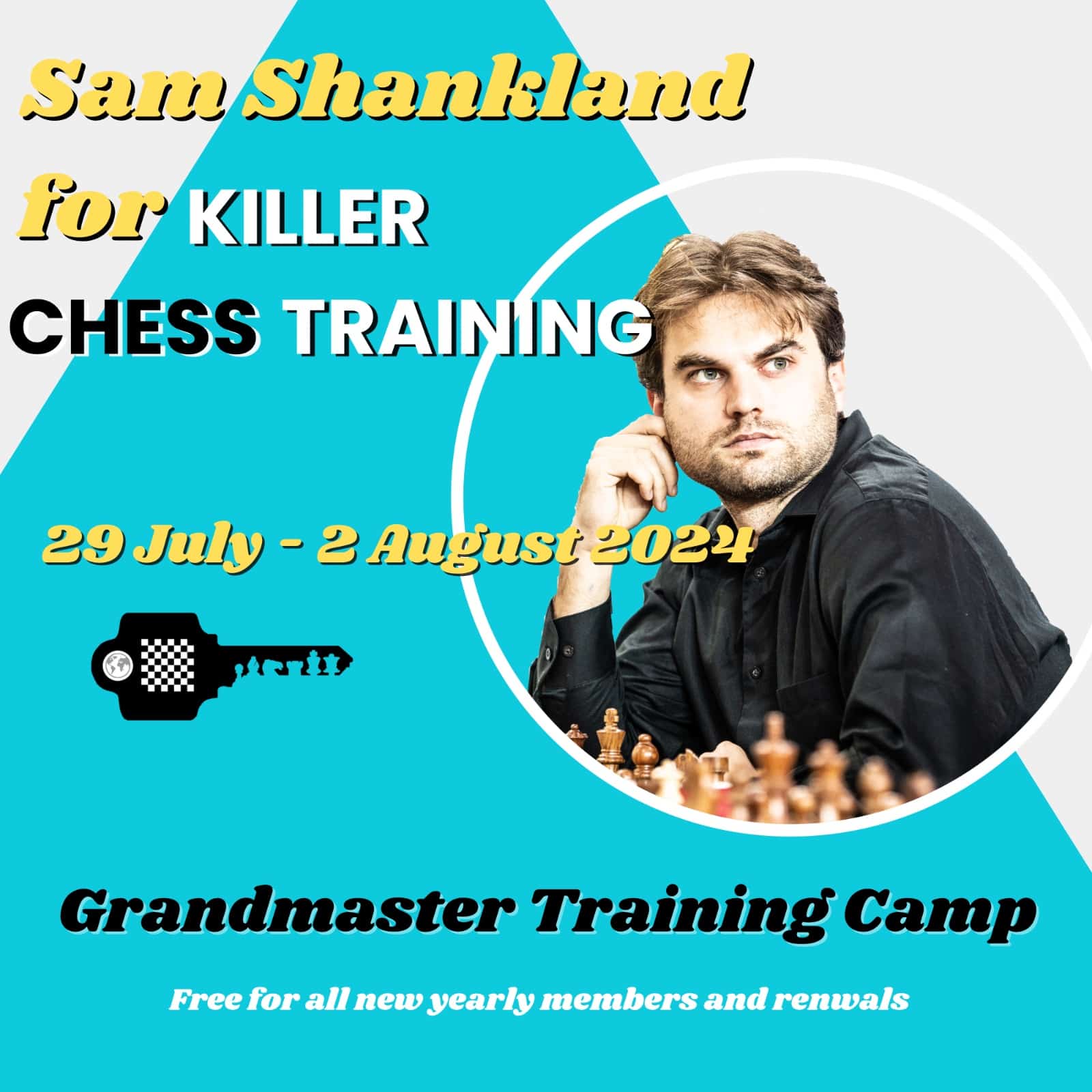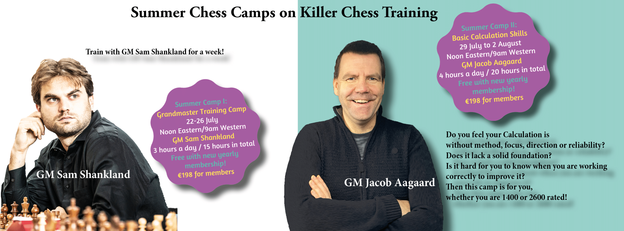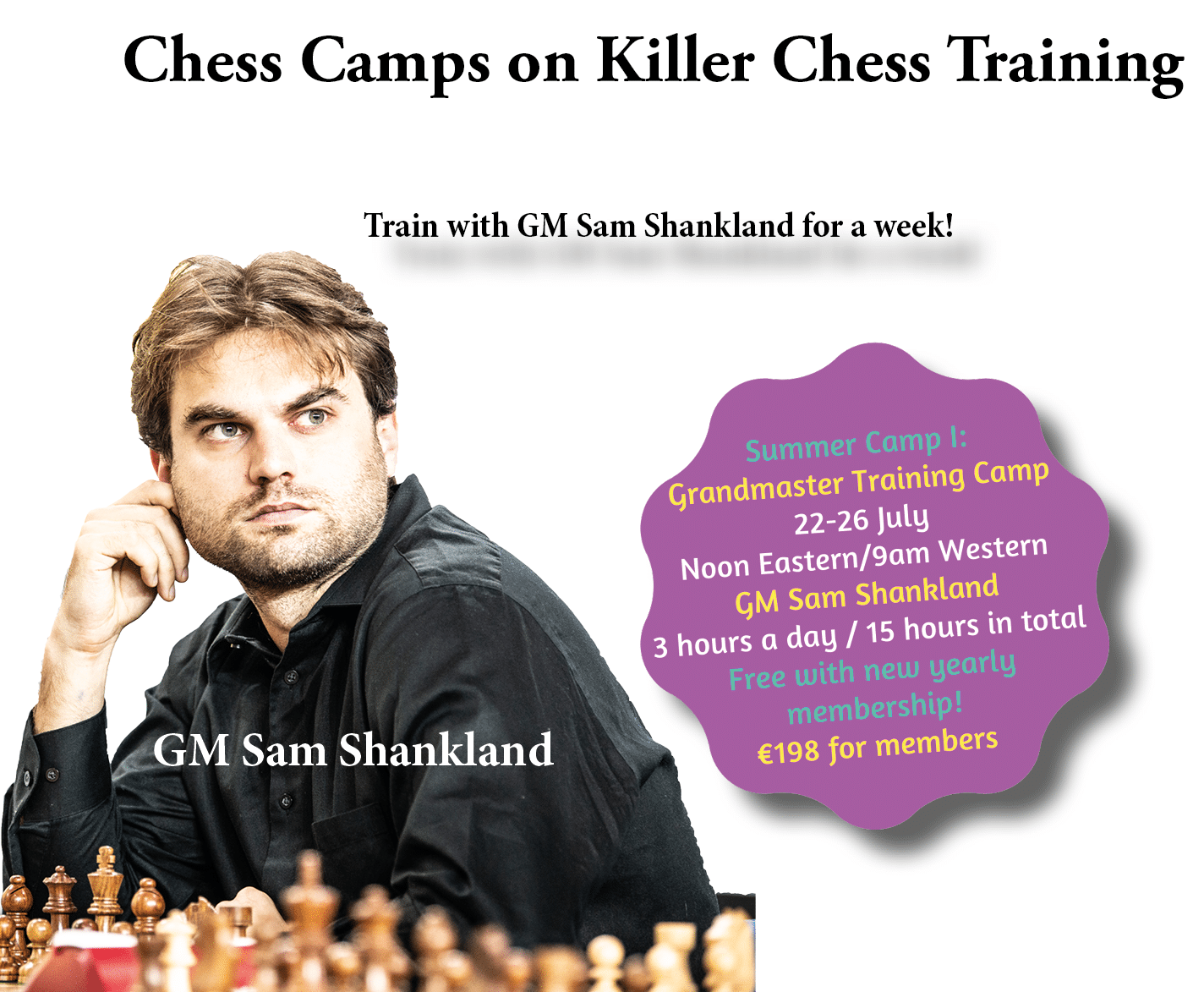 The camp will be a training camp in Technique and practical endgame play. The camp is designed so that all players will be able to challenge themselves more and more. Each session (15 in total) will have 6 exercises, where the easiest is solvable for all, and the hardest will challenge Sam, a world class grandmaster.